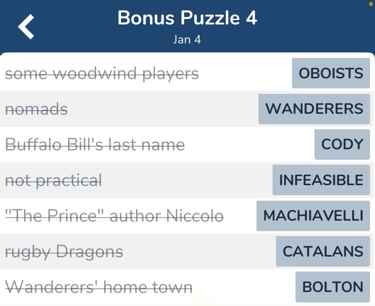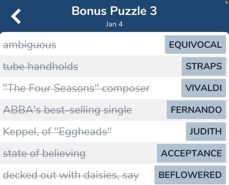 7 Little Words is a word puzzle game in which players are presented with a series of clues and must use the clues to determine the correct words. 7 Little Words is available on a variety of platforms, including mobile devices and web browsers. It is free to play, but some in-game features may be available for purchase. We are sharing 7 Little Words puzzle game daily answers for January 4 2024. Also in this page you can find 7 Little Words Bonus Puzzles all Answers. Enjoy!
