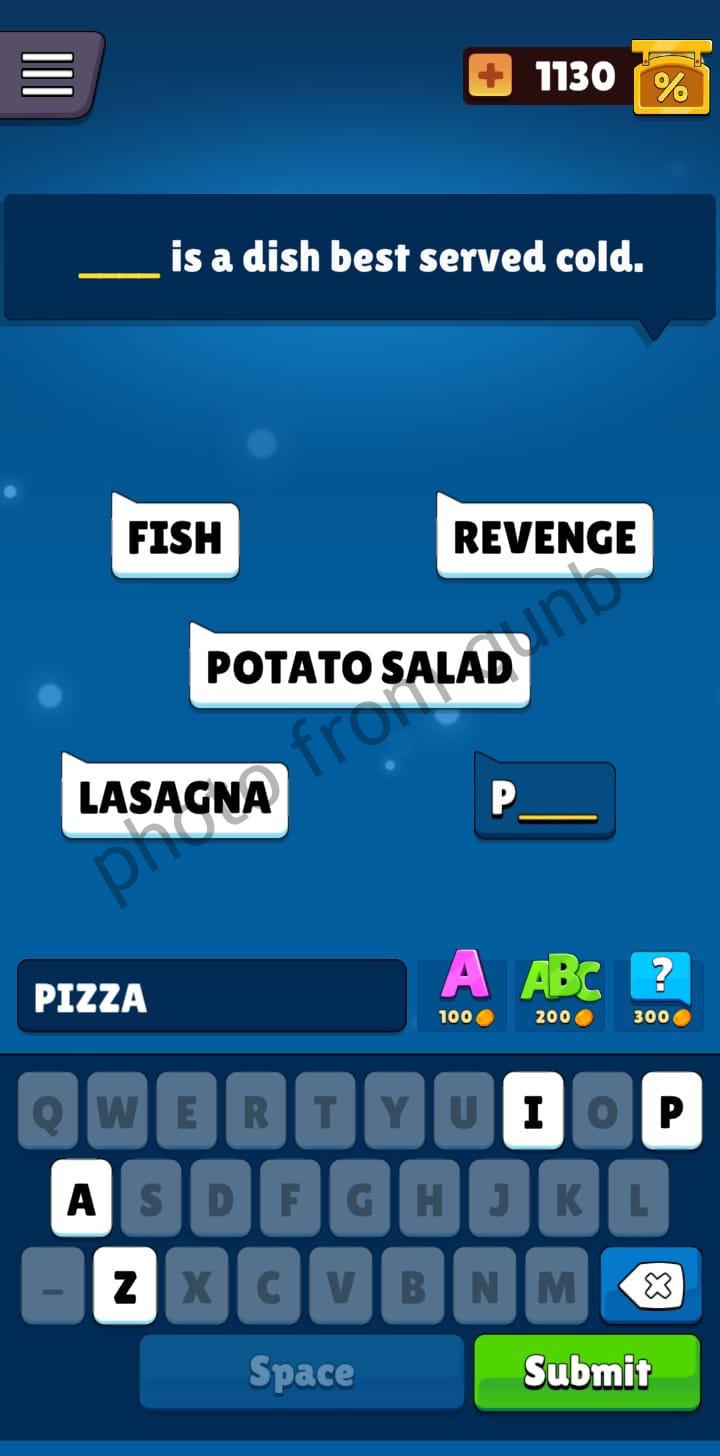 Popular Words Game is created by Unico Studio. Game including hundreds of unique questions, free Daily challenges and bonus rewards. You can play this game offline anytime and anywhere.For pass the level you have to guess 5 words that are missing in the sentence. For this, like hint is provided first letter of the every word. The levels of the game start with the easiest and continue with more difficult puzzles. If you need help for some levels – you can find it in our website. Here you can find photo with all answers for “____ is a dish best served cold” which is a question from Level 238 Popular Words Game. Below answers follow link to all answers of the game. Enjoy your game!