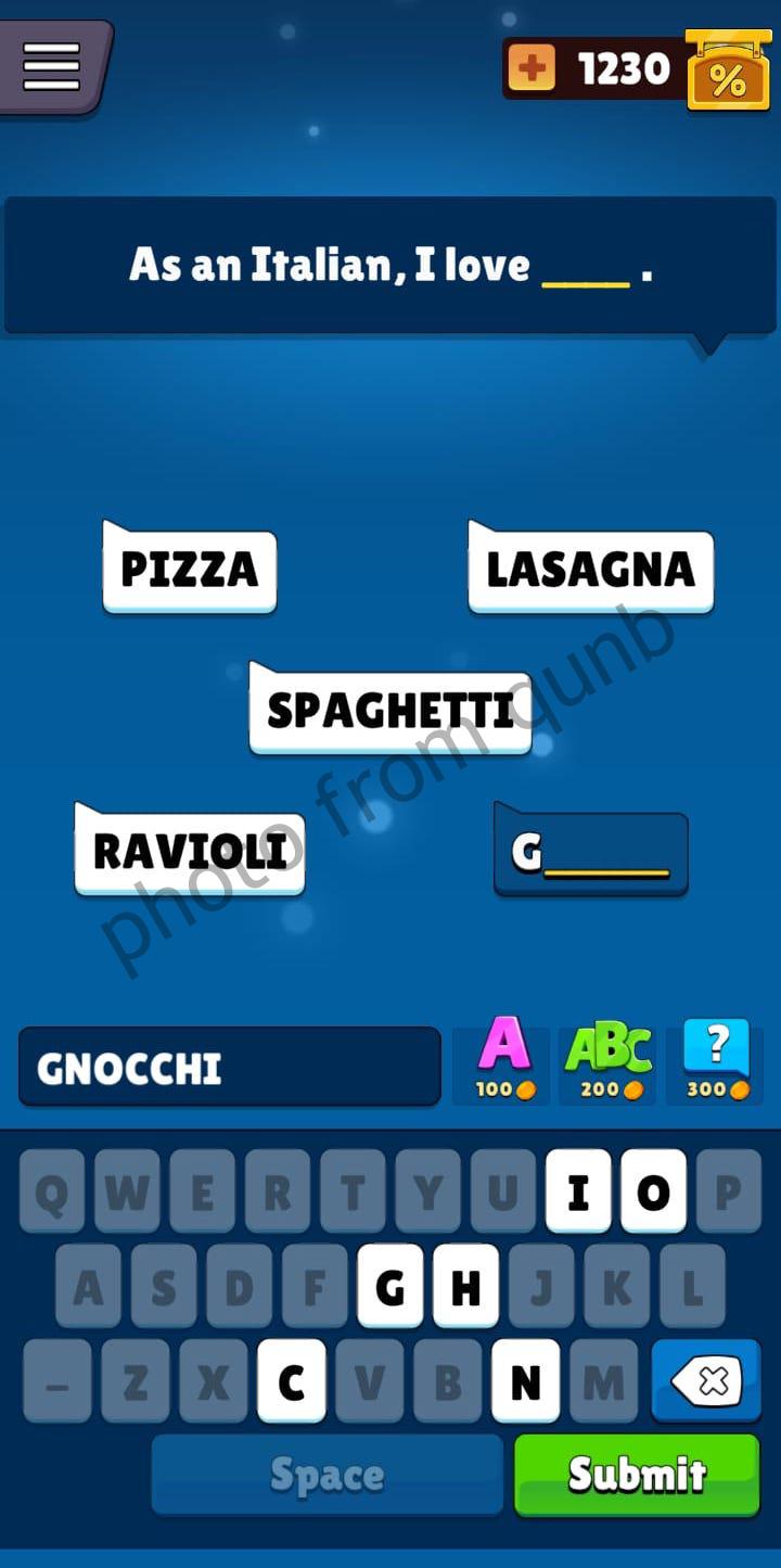 Popular Words Game is created by Unico Studio. Game including hundreds of unique questions, free Daily challenges and bonus rewards. You can play this game offline anytime and anywhere.For pass the level you have to guess 5 words that are missing in the sentence. For this, like hint is provided first letter of the every word. The levels of the game start with the easiest and continue with more difficult puzzles. If you need help for some levels – you can find it in our website. Here you can find photo with all answers for “As an Italian, I love ____” which is a question from Level 298 Popular Words Game. Below answers follow link to all answers of the game. Enjoy your game!