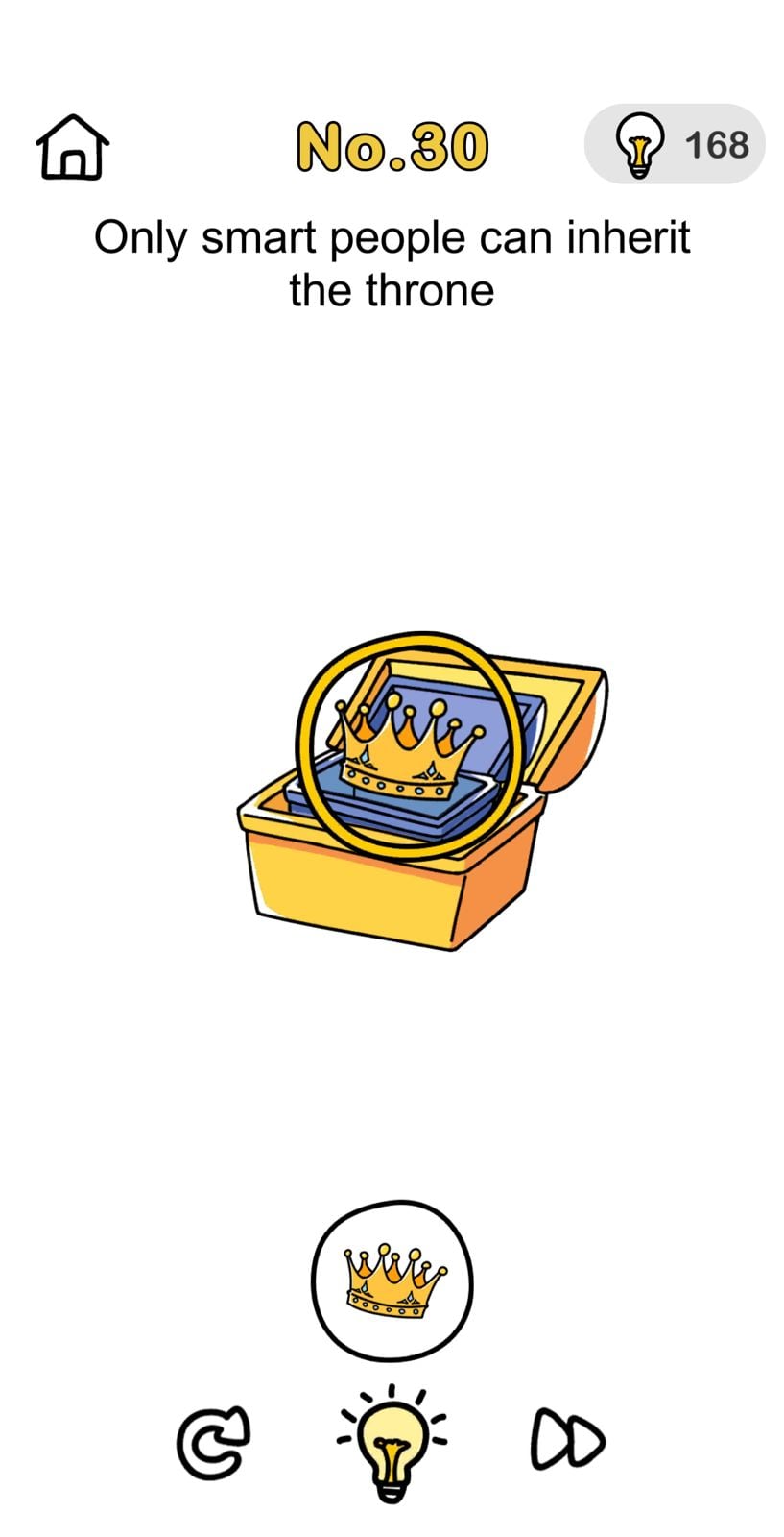 Qunb providing answers for Brain Out Crazy Find Pack No 30 (Level 30) for “Only smart people can inherit the throne” . So you can check below:
