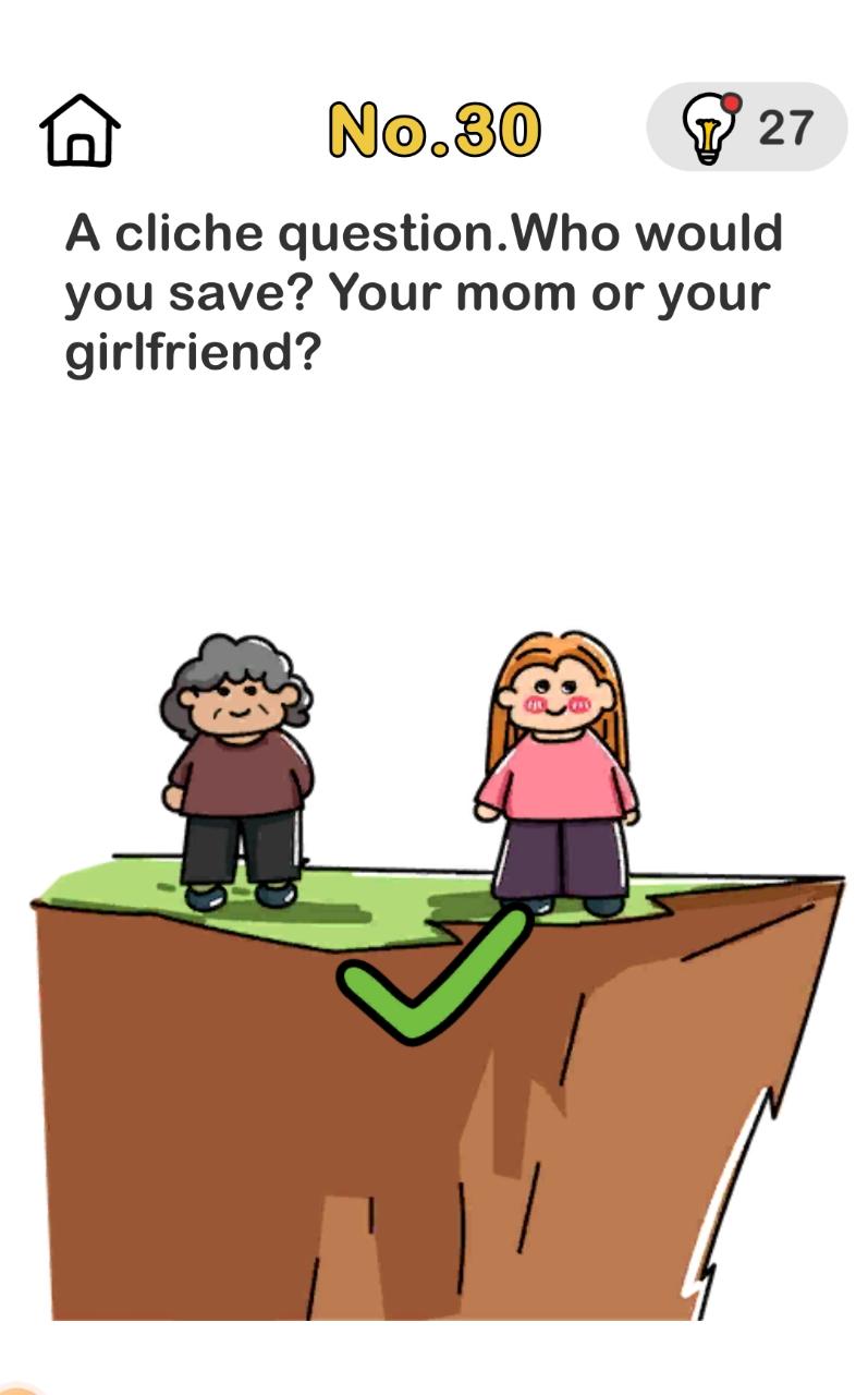 Qunb providing answers for Brain Out No 30 (Level 30) for “A cliche question. Who would you save? Your mom or your girlfriend” level. So you can check below: