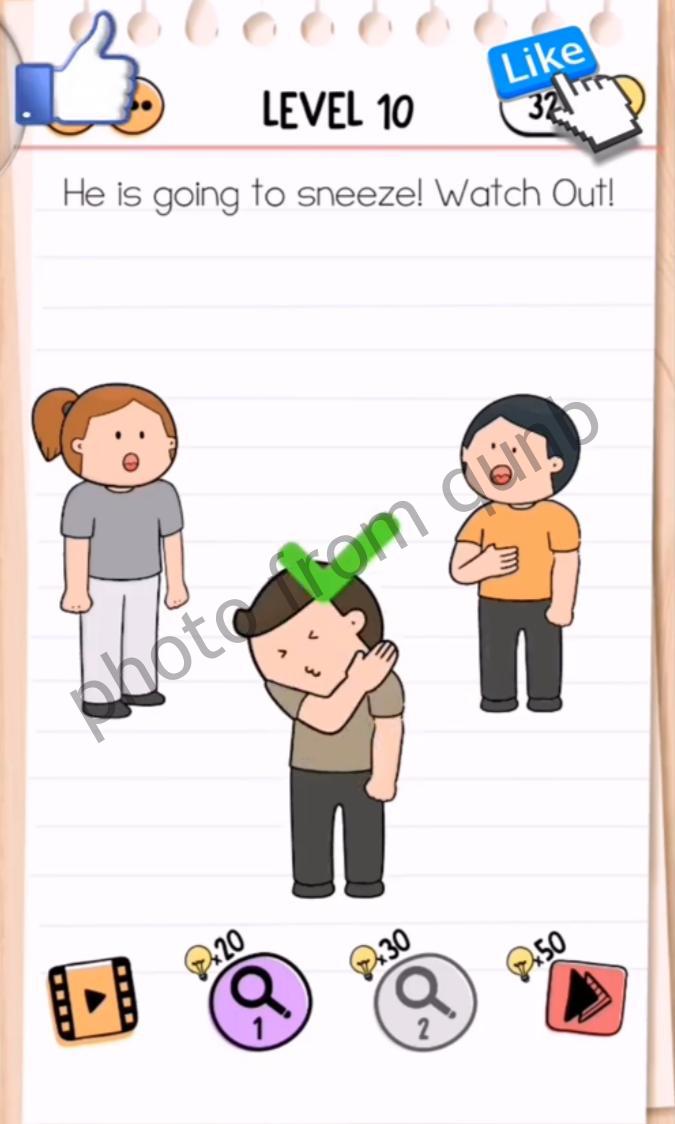 Brain Test 2: Tricky Stories is a brain teaser mobile game app – second part of most popular game in the word Brain Test: Tricky Puzzles. Brain Test 2 has different packs and we are sharing solutions. Here you can see photo and below photo short explanation how we solved Level 10 He is going to sneeze! Watch Out! Naughty Microbes Brain Test 2: Tricky Stories. If you have more questions please comment this page and we will try help you.