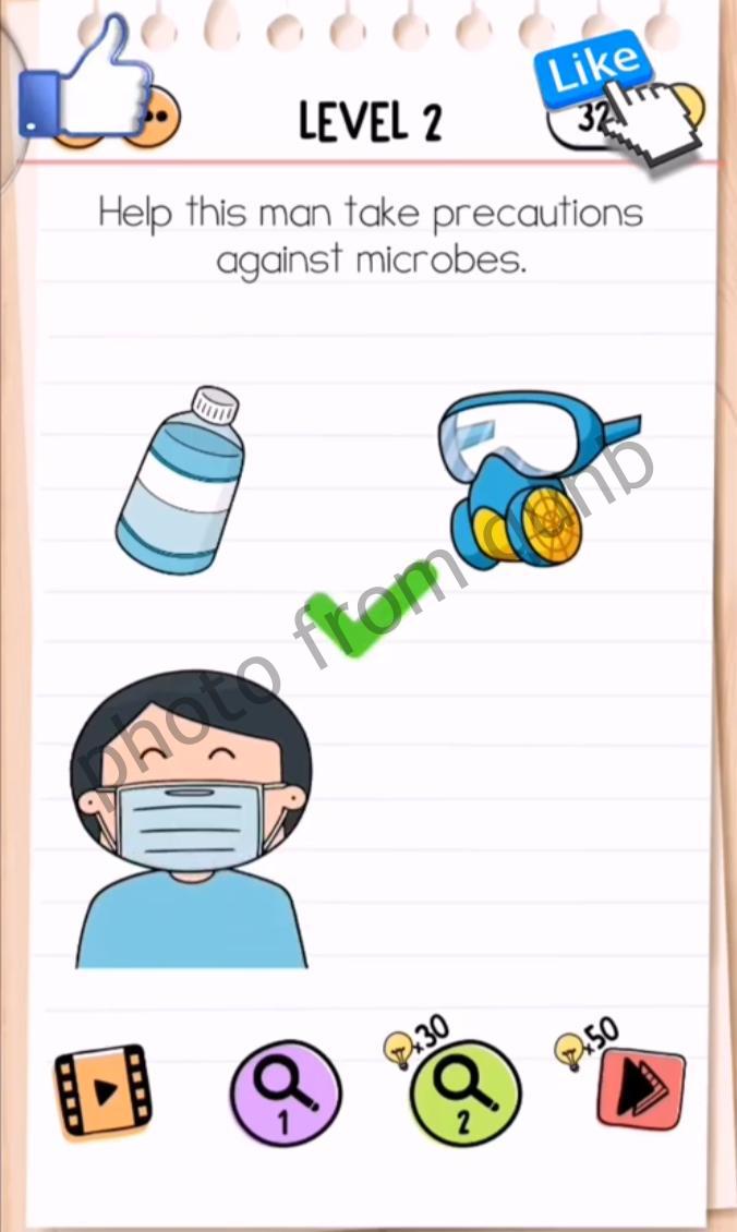 Brain Test 2: Tricky Stories is a brain teaser mobile game app – second part of most popular game in the word Brain Test: Tricky Puzzles. Brain Test 2 has different packs and we are sharing solutions. Here you can see photo and below photo short explanation how we solved Level 2 Help this man take precautions against microbes Naughty Microbes Brain Test 2: Tricky Stories. If you have more questions please comment this page and we will try help you.