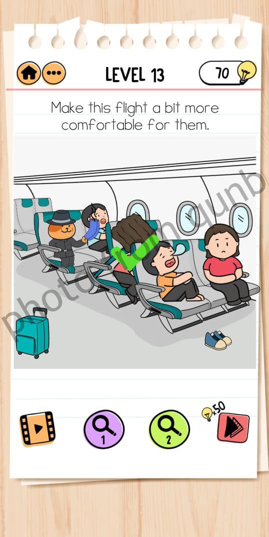Brain Test 2: Tricky Stories is a brain teaser mobile game app – second part of most popular game in the word Brain Test: Tricky Puzzles. Brain Test 2 has different packs and we are sharing solutions. Here you can see photo and below photo short explanation how we solved Level 13 Make this flight a bit more comfortable for them Tom’s Adventure Brain Test 2: Tricky Stories. If you have more questions please comment this page and we will try help you.