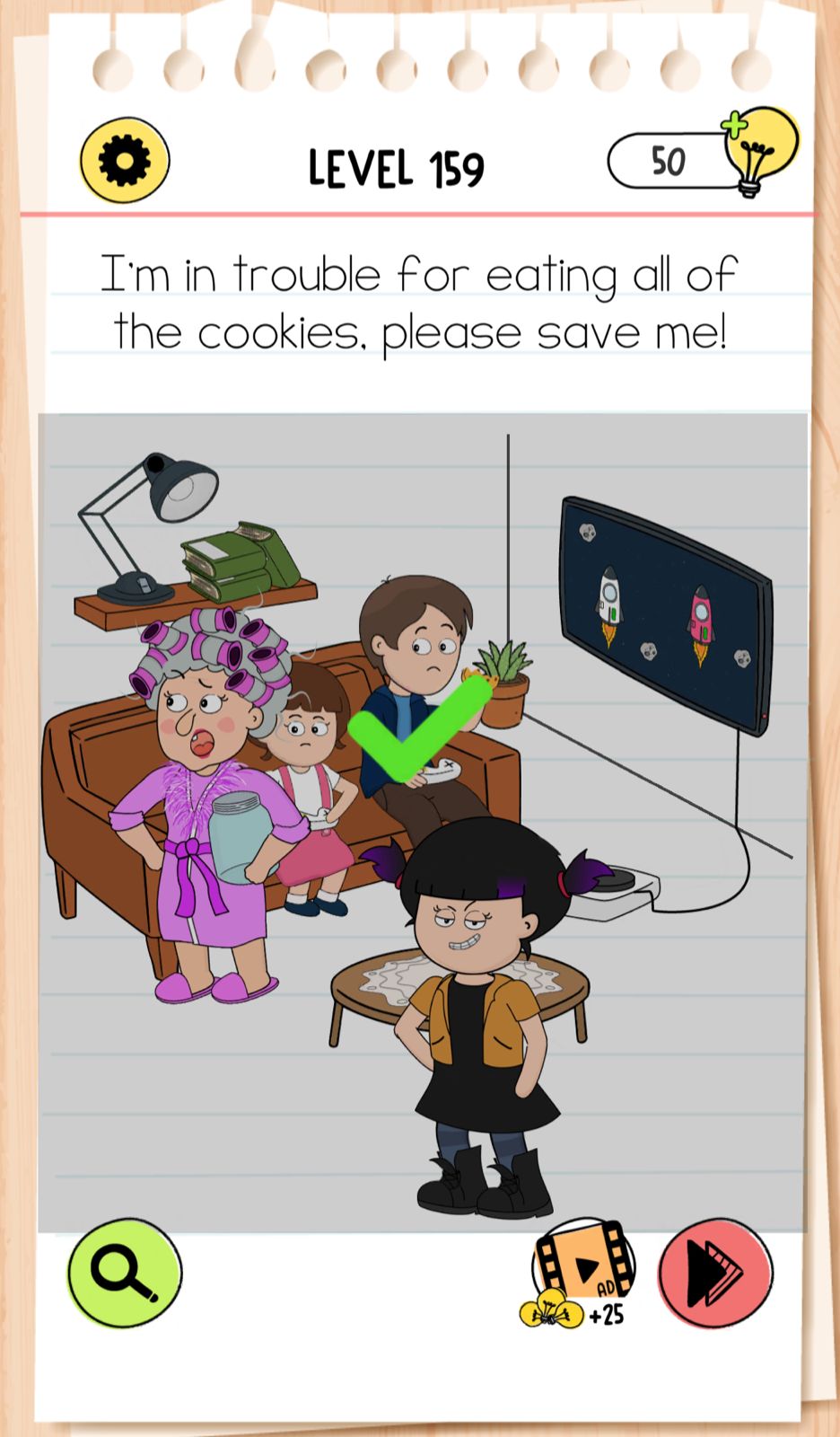 Unico Studio recently published a new part of brain teaser game – Brain Test 4. Game as always including new characters, funny puzzles, riddles and you need really to trick your brain for solve them. Sometimes levels will not be so easy and you will need some help. Here you can find the way how to solve Level 159 I’m in trouble for eating all of the cookies, please save me Brain Test 4 Game. We are sharing with you photo with solved level. For better understanding below photo we also added explanation step by step how we did it. For more answers please follow link below explanations. Enjoy your game with our answers!