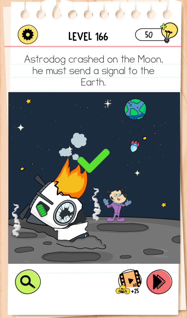 Unico Studio recently published a new part of brain teaser game – Brain Test 4. Game as always including new characters, funny puzzles, riddles and you need really to trick your brain for solve them. Sometimes levels will not be so easy and you will need some help. Here you can find the way how to solve Level 166 Astrodog crashed on the Moon, he must send a signal to the earth Brain Test 4 Game. We are sharing with you photo with solved level. For better understanding below photo we also added explanation step by step how we did it. For more answers please follow link below explanations. Enjoy your game with our answers!