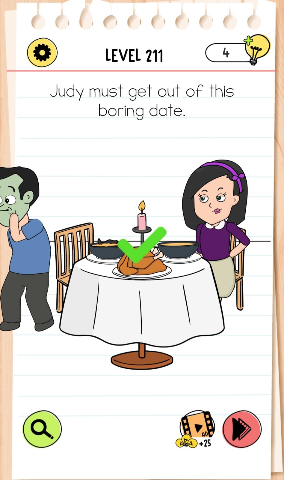 Unico Studio recently published a new part of brain teaser game – Brain Test 4. Game as always including new characters, funny puzzles, riddles and you need really to trick your brain for solve them. Sometimes levels will not be so easy and you will need some help. Here you can find the way how to solve Level 211 Judy must get out of this boring date Brain Test 4 Game. We are sharing with you photo with solved level. For better understanding below photo we also added explanation step by step how we did it. For more answers please follow link below explanations. Enjoy your game with our answers!