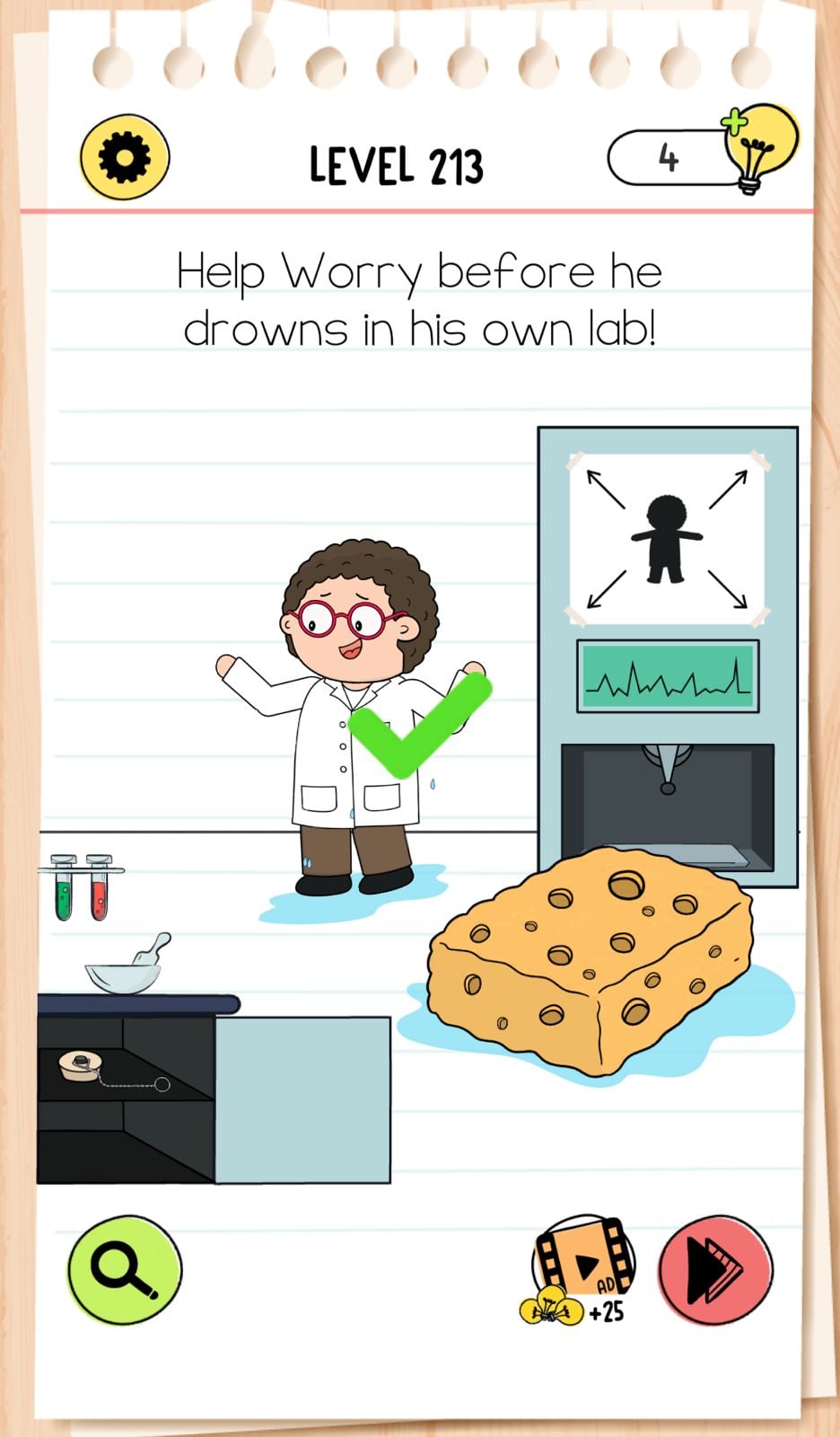 Unico Studio recently published a new part of brain teaser game – Brain Test 4. Game as always including new characters, funny puzzles, riddles and you need really to trick your brain for solve them. Sometimes levels will not be so easy and you will need some help. Here you can find the way how to solve Level 213 Help Worry before he drowns in his own lab Brain Test 4 Game. We are sharing with you photo with solved level. For better understanding below photo we also added explanation step by step how we did it. For more answers please follow link below explanations. Enjoy your game with our answers!