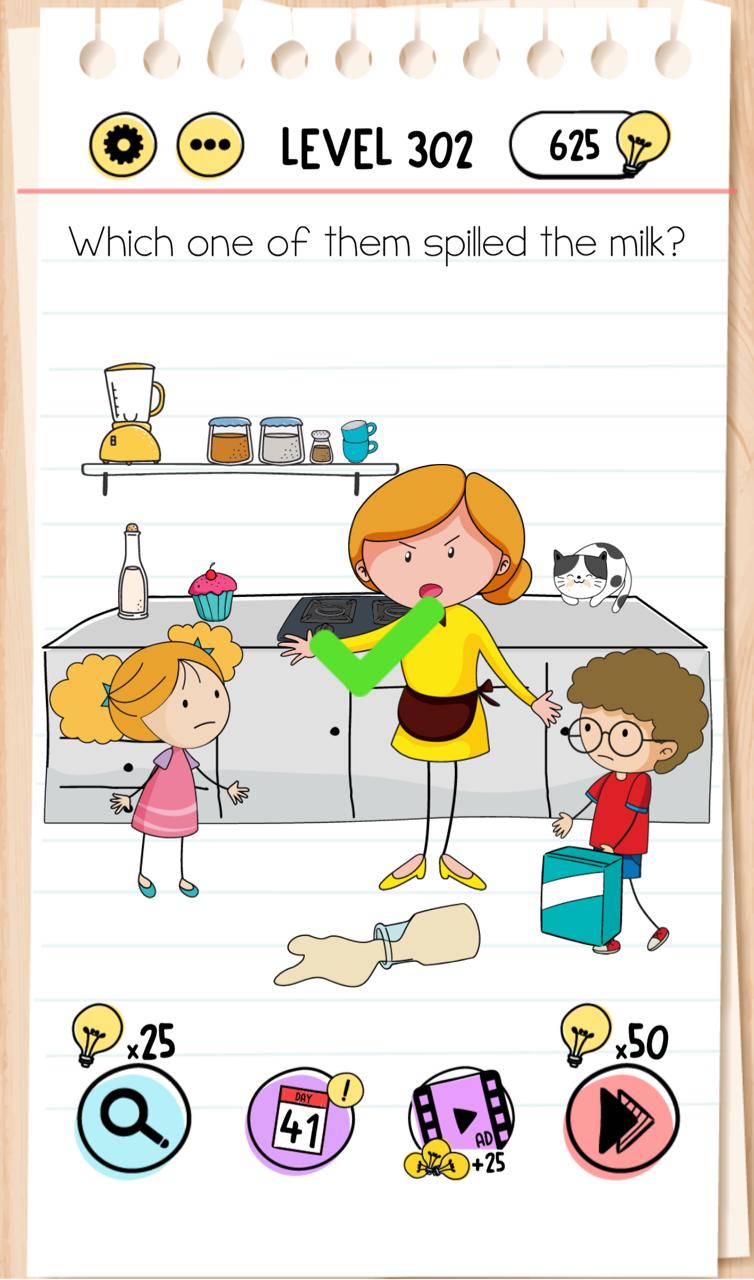 Brain Test is a brain teaser mobile game app. Brain Test has hundreds levels and we are sharing solutions. Brain Test already downloaded by lot of people that millions. This is a hard game in some levels and you can stuck on some level as Level 302 “Which one of them spilled the milk”.