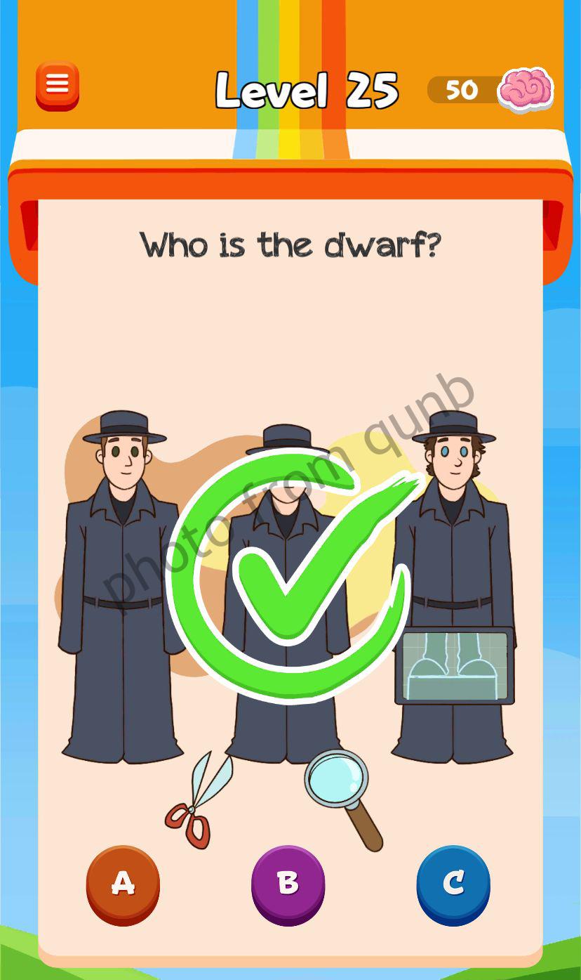 Braindom 3: Smart, Brain Games is a third part of Braindom game from MATCHINGHAM GAMES LIMITED with different kind of new puzzles and riddles. Here you can see photo and below photo explanation how we solved Level 25 “Who is the dwarf” Braindom 3 Game. If you have more questions please comment this page and we will try help you. If you need more levels answers please click link below solutions of this level.
