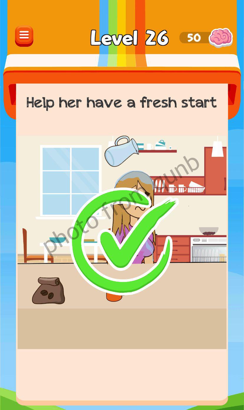 Braindom 3: Smart, Brain Games is a third part of Braindom game from MATCHINGHAM GAMES LIMITED with different kind of new puzzles and riddles. Here you can see photo and below photo explanation how we solved Level 26 “Help her have a fresh start” Braindom 3 Game. If you have more questions please comment this page and we will try help you. If you need more levels answers please click link below solutions of this level.