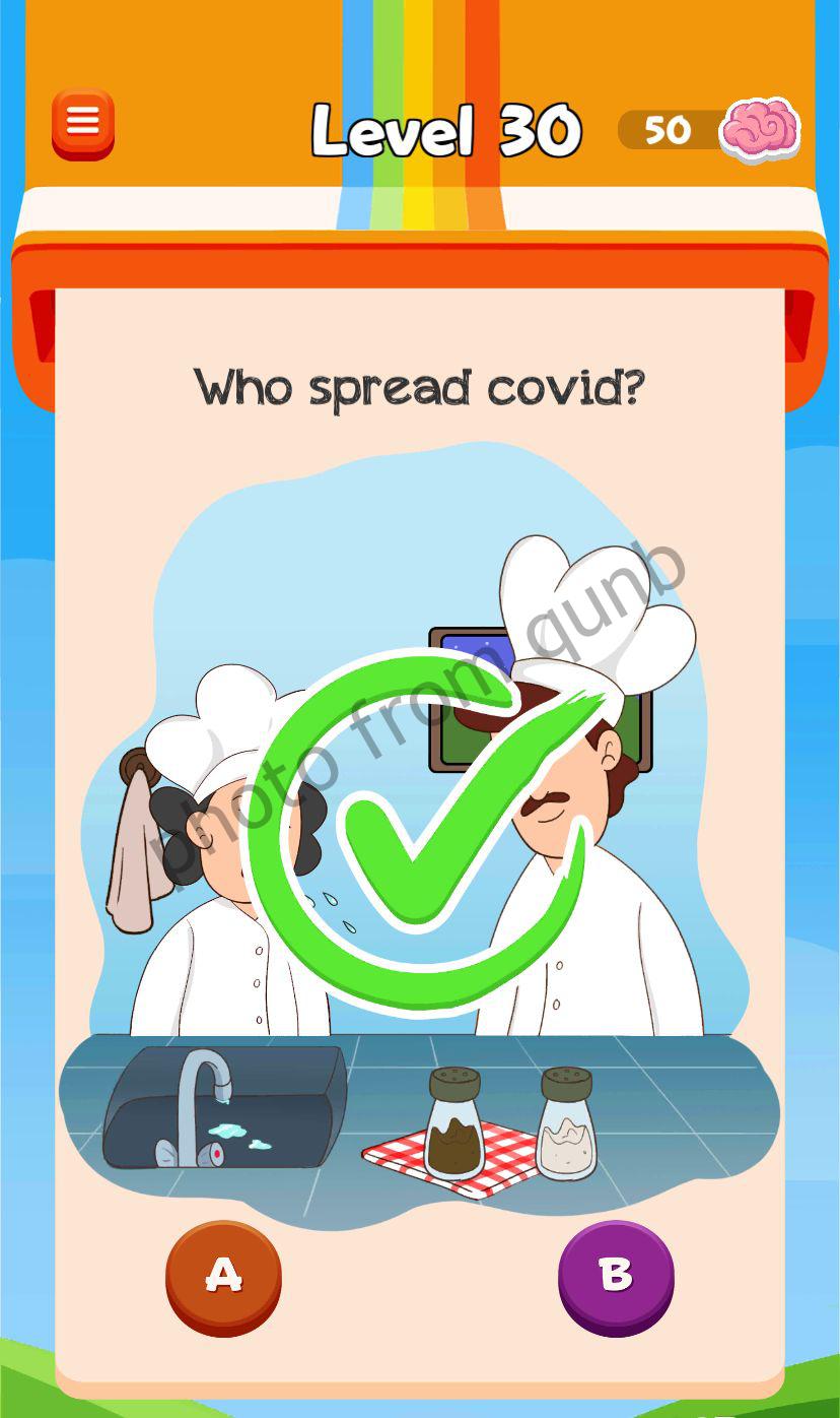 Braindom 3: Smart, Brain Games is a third part of Braindom game from MATCHINGHAM GAMES LIMITED with different kind of new puzzles and riddles. Here you can see photo and below photo explanation how we solved Level 30 “Who spread covid” Braindom 3 Game. If you have more questions please comment this page and we will try help you. If you need more levels answers please click link below solutions of this level.