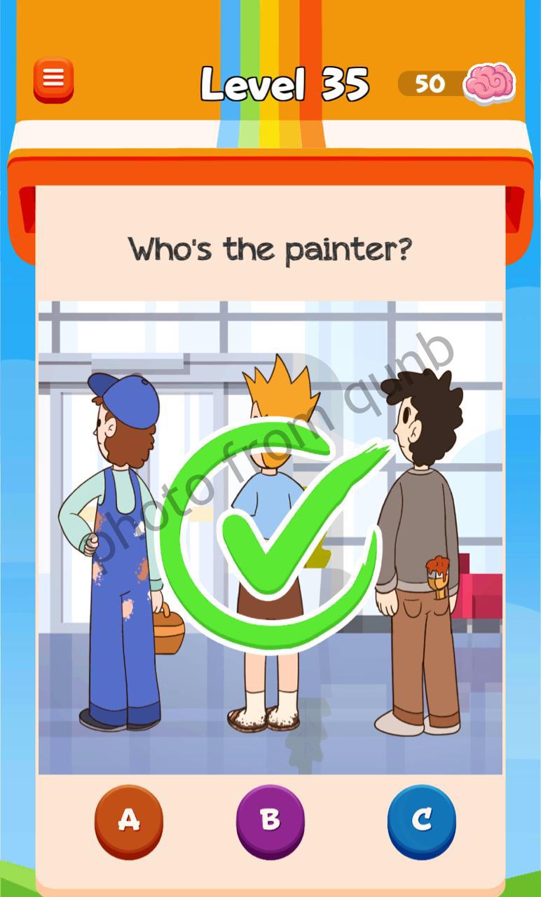 Braindom 3: Smart, Brain Games is a third part of Braindom game from MATCHINGHAM GAMES LIMITED with different kind of new puzzles and riddles. Here you can see photo and below photo explanation how we solved Level 35 “Who’s the painter” Braindom 3 Game. If you have more questions please comment this page and we will try help you. If you need more levels answers please click link below solutions of this level.