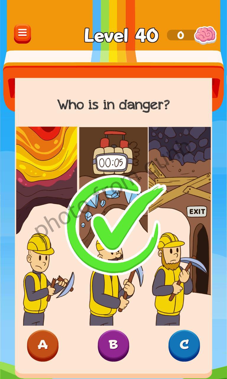 Braindom 3: Smart, Brain Games is a third part of Braindom game from MATCHINGHAM GAMES LIMITED with different kind of new puzzles and riddles. Here you can see photo and below photo explanation how we solved Level 40 “Who is in danger” Braindom 3 Game. If you have more questions please comment this page and we will try help you. If you need more levels answers please click link below solutions of this level.