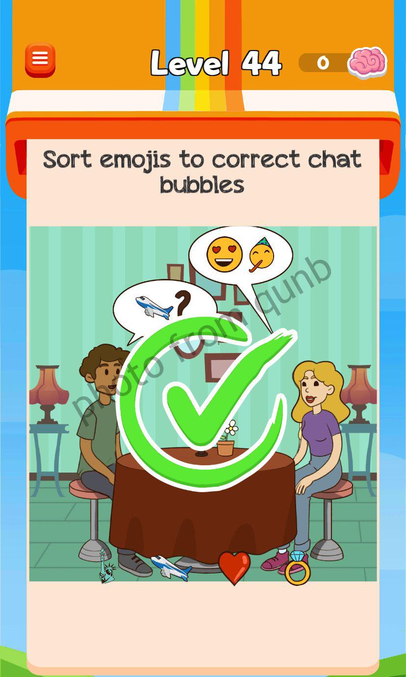Braindom 3: Smart, Brain Games is a third part of Braindom game from MATCHINGHAM GAMES LIMITED with different kind of new puzzles and riddles. Here you can see photo and below photo explanation how we solved Level 44 “Sort emojis to correct chat bubbles” Braindom 3 Game. If you have more questions please comment this page and we will try help you. If you need more levels answers please click link below solutions of this level.