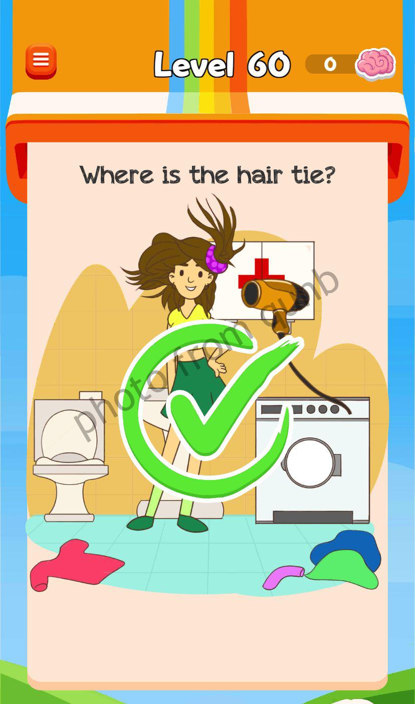 Braindom 3: Smart, Brain Games is a third part of Braindom game from MATCHINGHAM GAMES LIMITED with different kind of new puzzles and riddles. Here you can see photo and below photo explanation how we solved Level 60 “Where is the hair tie” Braindom 3 Game. If you have more questions please comment this page and we will try help you. If you need more levels answers please click link below solutions of this level.
