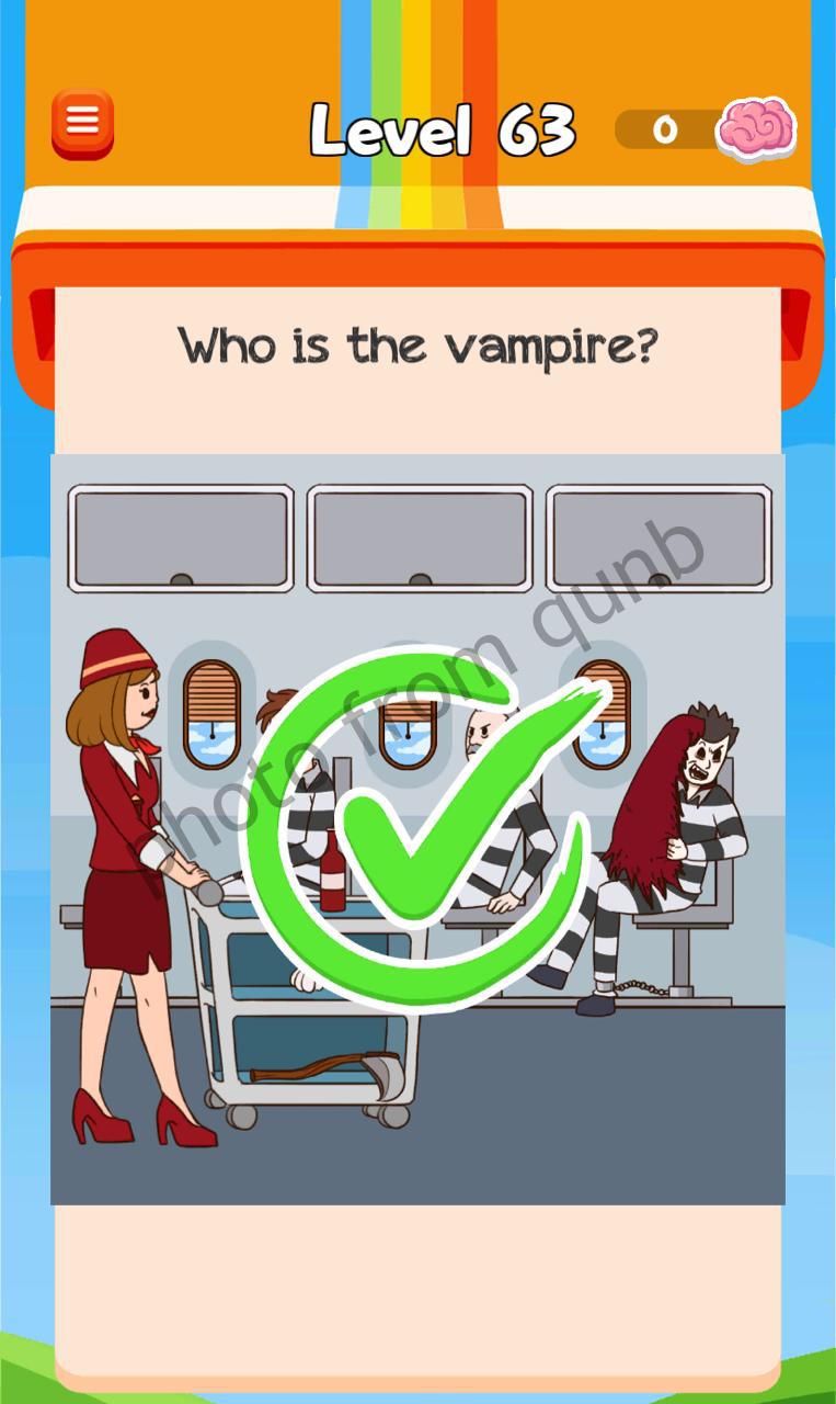 Braindom 3: Smart, Brain Games is a third part of Braindom game from MATCHINGHAM GAMES LIMITED with different kind of new puzzles and riddles. Here you can see photo and below photo explanation how we solved Level 63 “Who is the vampire” Braindom 3 Game. If you have more questions please comment this page and we will try help you. If you need more levels answers please click link below solutions of this level.