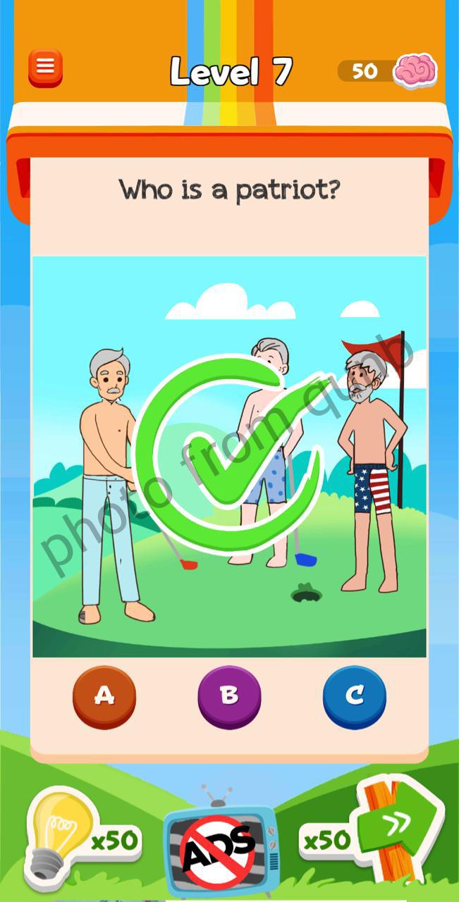 Braindom 3: Smart, Brain Games is a third part of Braindom game from MATCHINGHAM GAMES LIMITED with different kind of new puzzles and riddles. Here you can see photo and below photo explanation how we solved Level 7 “Who is a patriot” Braindom 3 Game. If you have more questions please comment this page and we will try help you. If you need more levels answers please click link below solutions of this level.