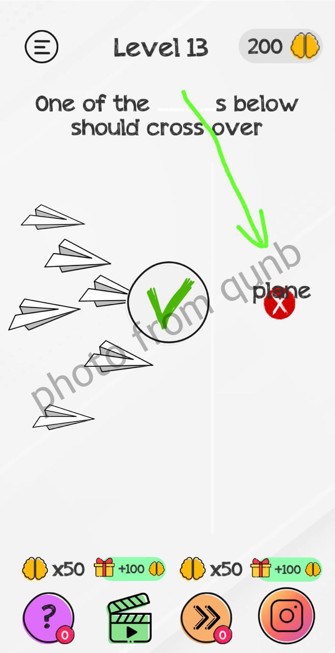 Braindom: Tricky Brain Puzzles is a brain teaser mobile game app with different kind of puzzles and riddles. Here you can see photo and below photo short explanation how we solved Level 13 One of the planes below should cross over Braindom: Tricky Brain Puzzles. If you have more questions please comment this page and we will try help you. If you need more levels answers please click link below solutions of this level.