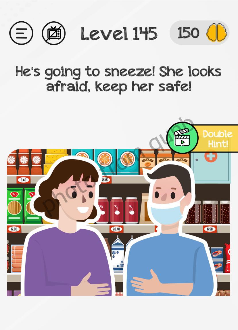 Braindom: Tricky Brain Puzzles is a brain teaser mobile game app with different kind of puzzles and riddles. Here you can see photo and below photo short explanation how we solved Level 145 He’s going to sneeze! She looks afraid, keep her safe Braindom: Tricky Brain Puzzles. If you have more questions please comment this page and we will try help you. If you need more levels answers please click link below solutions of this level.