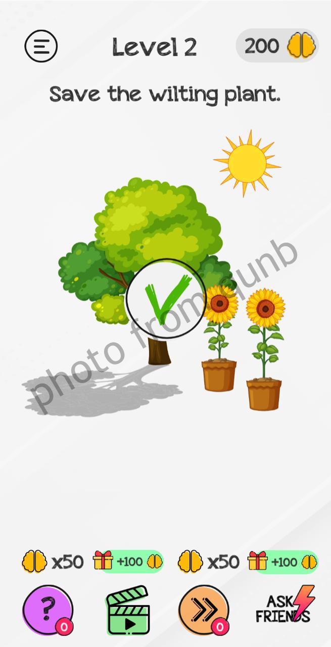 Braindom: Tricky Brain Puzzles is a brain teaser mobile game app with different kind of puzzles and riddles. Here you can see photo and below photo short explanation how we solved Level 2 Save the wilting plant Braindom: Tricky Brain Puzzles. If you have more questions please comment this page and we will try help you. If you need more levels answers please click link below solutions of this level.