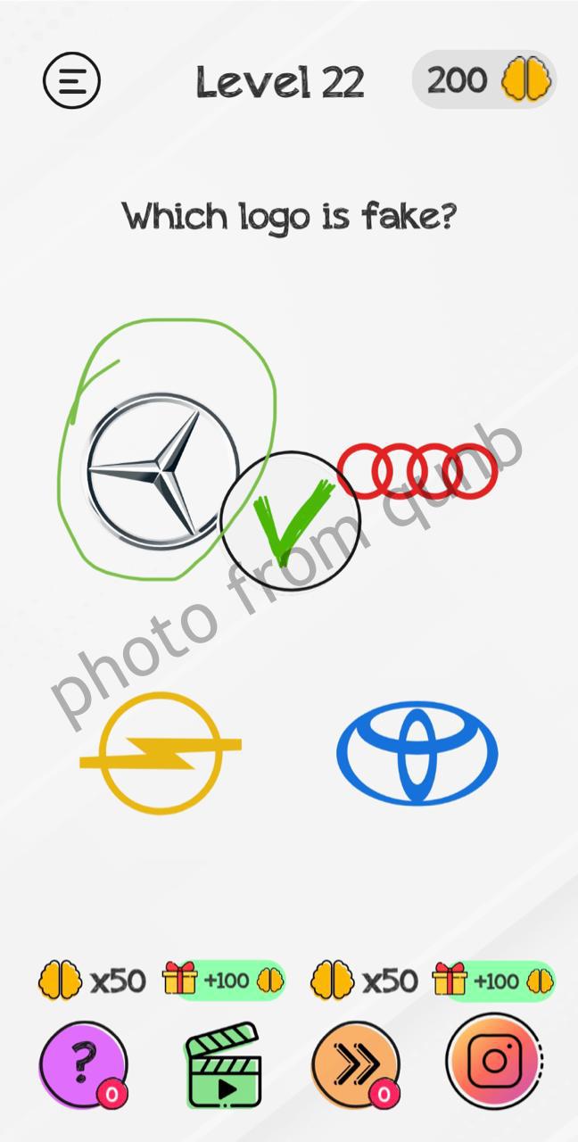 Braindom: Tricky Brain Puzzles is a brain teaser mobile game app with different kind of puzzles and riddles. Here you can see photo and below photo short explanation how we solved Level 22 Which logo is fake Braindom: Tricky Brain Puzzles. If you have more questions please comment this page and we will try help you. If you need more levels answers please click link below solutions of this level.