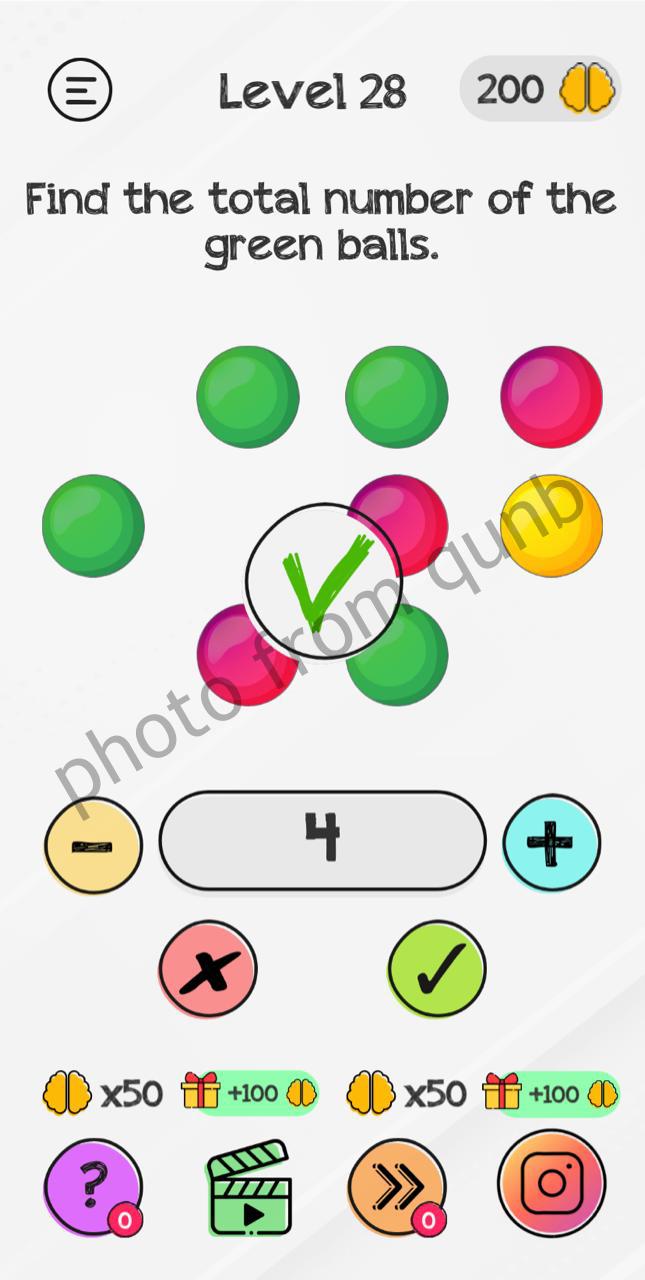 Braindom: Tricky Brain Puzzles is a brain teaser mobile game app with different kind of puzzles and riddles. Here you can see photo and below photo short explanation how we solved Level 28 Find the total number of the green balls Braindom: Tricky Brain Puzzles. If you have more questions please comment this page and we will try help you. If you need more levels answers please click link below solutions of this level.