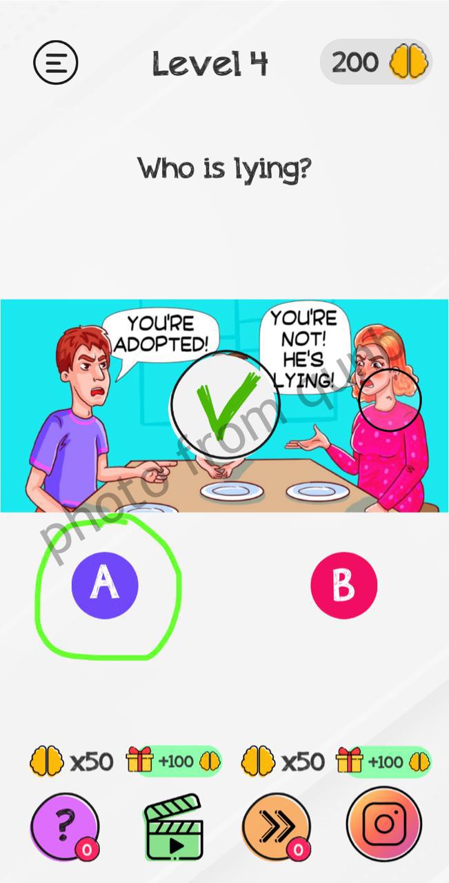 Braindom: Tricky Brain Puzzles is a brain teaser mobile game app with different kind of puzzles and riddles. Here you can see photo and below photo short explanation how we solved Level 4 Why is lying Braindom: Tricky Brain Puzzles. If you have more questions please comment this page and we will try help you. If you need more levels answers please click link below solutions of this level.