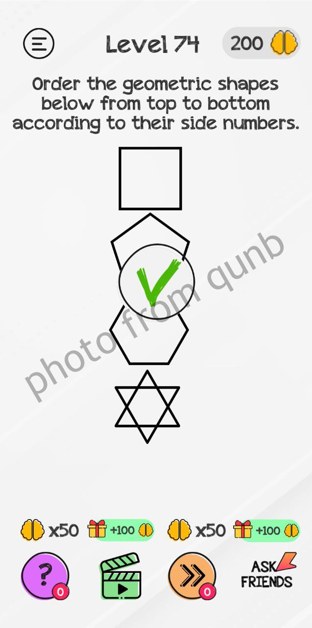 Braindom: Tricky Brain Puzzles is a brain teaser mobile game app with different kind of puzzles and riddles. Here you can see photo and below photo short explanation how we solved Level 74 Order the geometric shapes below from top to bottom according to their side numbers Braindom: Tricky Brain Puzzles. If you have more questions please comment this page and we will try help you. If you need more levels answers please click link below solutions of this level.