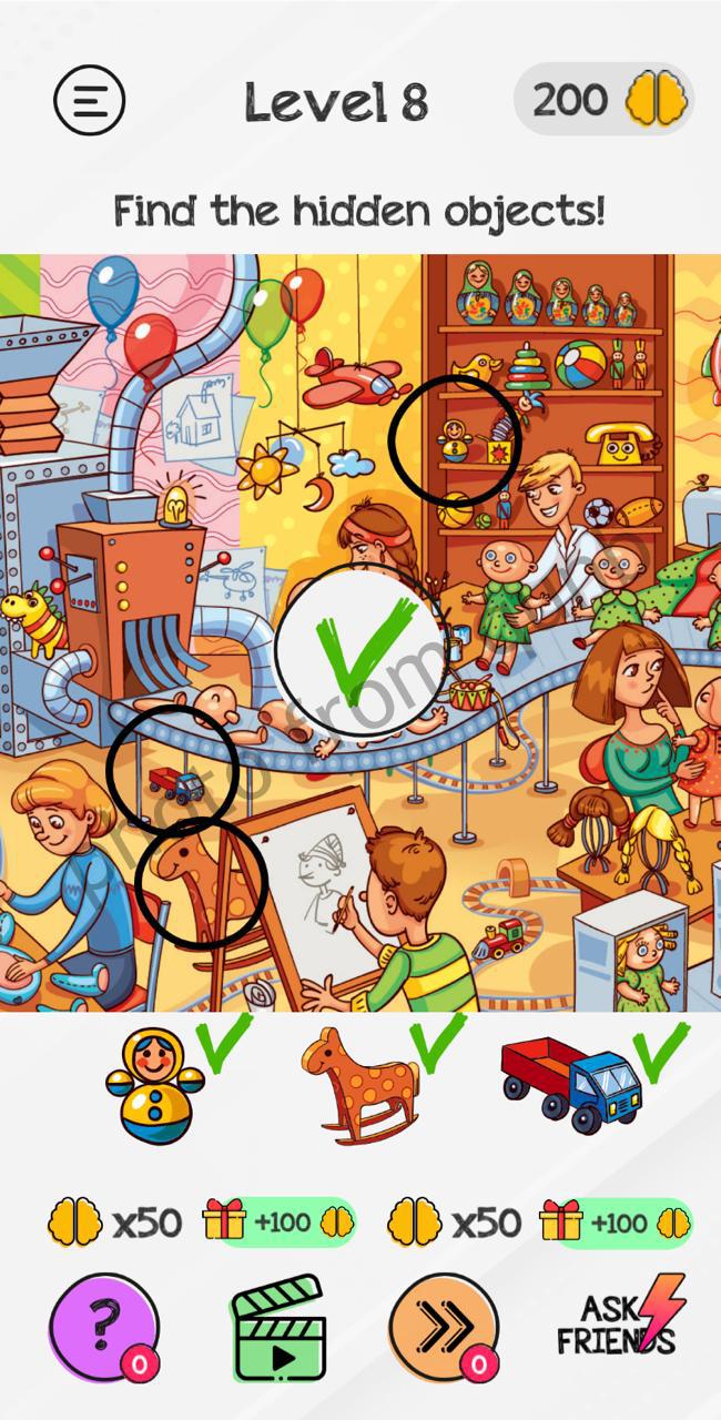 Braindom: Tricky Brain Puzzles is a brain teaser mobile game app with different kind of puzzles and riddles. Here you can see photo and below photo short explanation how we solved Level 8 Find the hidden objects Braindom: Tricky Brain Puzzles. If you have more questions please comment this page and we will try help you. If you need more levels answers please click link below solutions of this level.