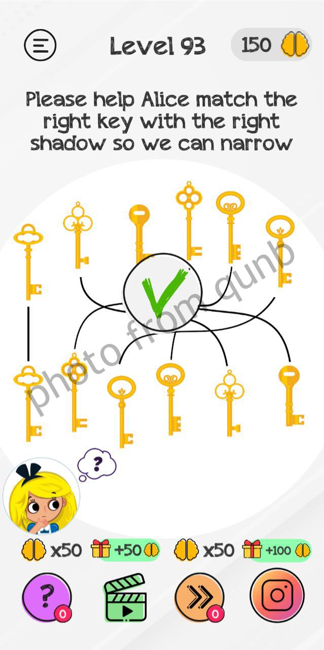Braindom: Tricky Brain Puzzles is a brain teaser mobile game app with different kind of puzzles and riddles. Here you can see photo and below photo short explanation how we solved Level 93 Please help Alice match the right key with the right shadow so we can narrow Braindom: Tricky Brain Puzzles. If you have more questions please comment this page and we will try help you. If you need more levels answers please click link below solutions of this level.
