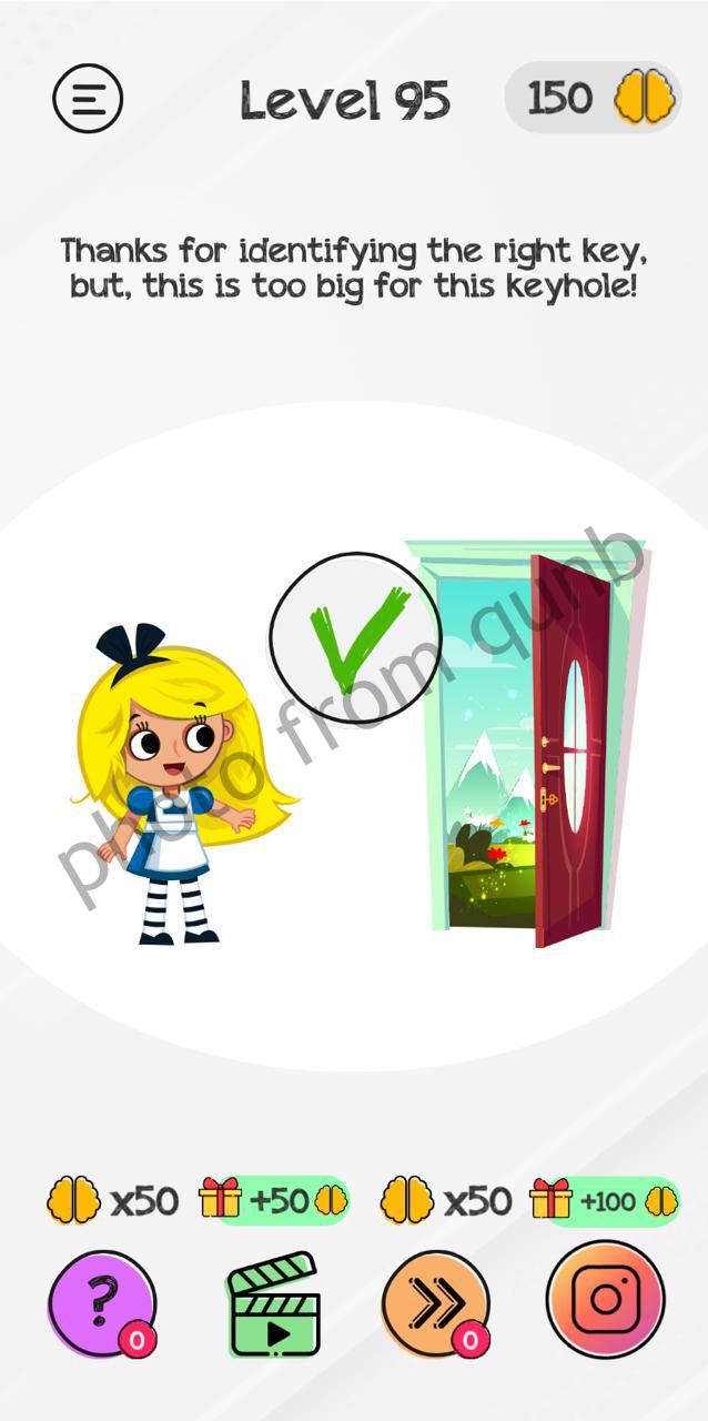 Braindom: Tricky Brain Puzzles is a brain teaser mobile game app with different kind of puzzles and riddles. Here you can see photo and below photo short explanation how we solved Level 95 Thanks for identifying the right key, but this is too big for this keyhole Braindom: Tricky Brain Puzzles. If you have more questions please comment this page and we will try help you. If you need more levels answers please click link below solutions of this level.