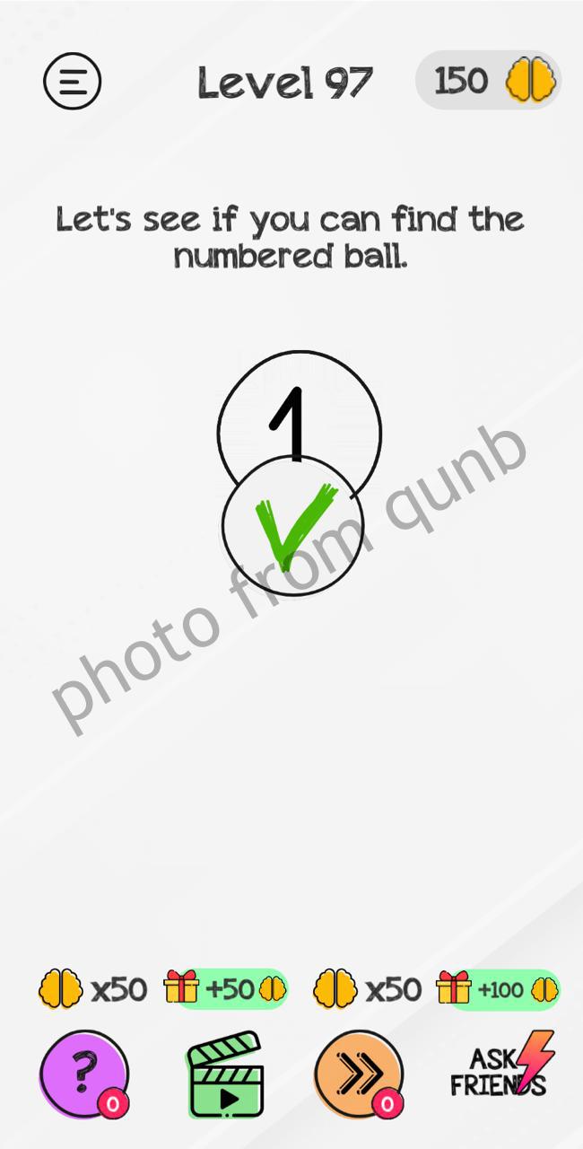 Braindom: Tricky Brain Puzzles is a brain teaser mobile game app with different kind of puzzles and riddles. Here you can see photo and below photo short explanation how we solved Level 97 Let’s see if you can find the numbered ball Braindom: Tricky Brain Puzzles. If you have more questions please comment this page and we will try help you. If you need more levels answers please click link below solutions of this level.