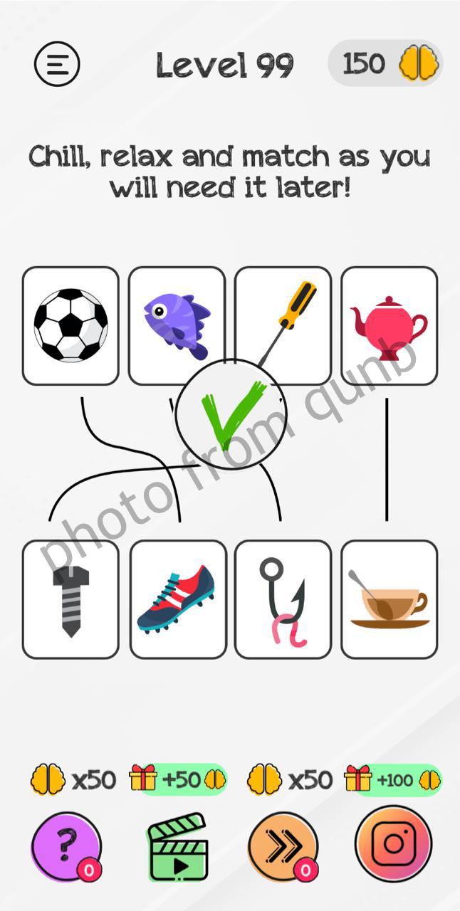 Braindom: Tricky Brain Puzzles is a brain teaser mobile game app with different kind of puzzles and riddles. Here you can see photo and below photo short explanation how we solved Level 99 Chill, relax and match as you will need it later Braindom: Tricky Brain Puzzles. If you have more questions please comment this page and we will try help you. If you need more levels answers please click link below solutions of this level.