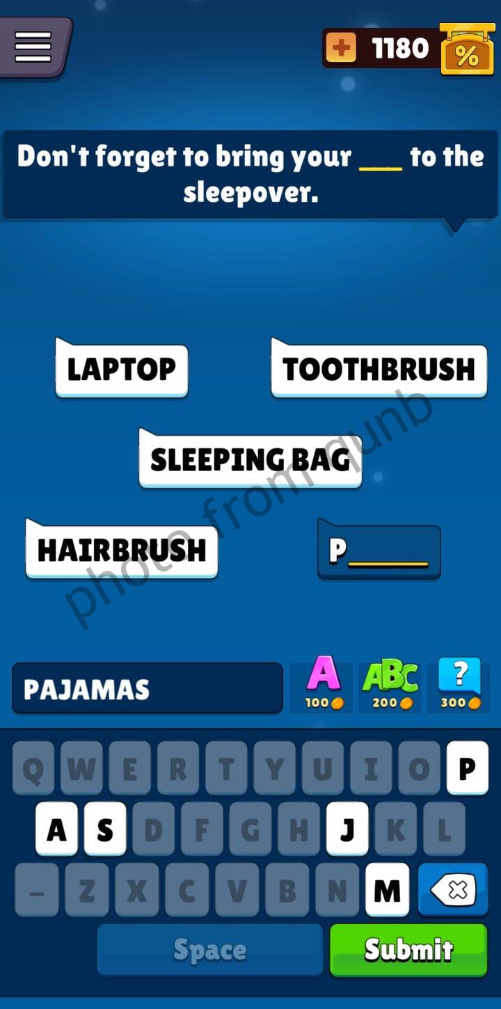 Popular Words Game is created by Unico Studio. Game including hundreds of unique questions, free Daily challenges and bonus rewards. You can play this game offline anytime and anywhere.For pass the level you have to guess 5 words that are missing in the sentence. For this, like hint is provided first letter of the every word. The levels of the game start with the easiest and continue with more difficult puzzles. If you need help for some levels – you can find it in our website. Here you can find photo with all answers for “Don’t forget to bring your ___ to the sleepover” which is a question from Level 268 Popular Words Game. Below answers follow link to all answers of the game. Enjoy your game!