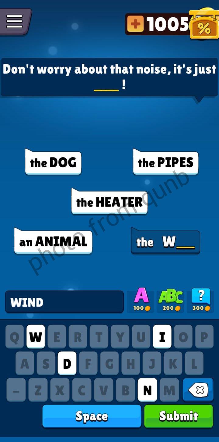 Popular Words Game is created by Unico Studio. Game including hundreds of unique questions, free Daily challenges and bonus rewards. You can play this game offline anytime and anywhere.For pass the level you have to guess 5 words that are missing in the sentence. For this, like hint is provided first letter of the every word. The levels of the game start with the easiest and continue with more difficult puzzles. If you need help for some levels – you can find it in our website. Here you can find photo with all answers for “Don’t worry about that noise, it’s just ____” which is a question from Level 166 Popular Words Game. Below answers follow link to all answers of the game. Enjoy your game!