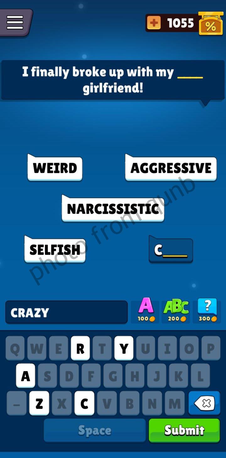 Popular Words Game is created by Unico Studio. Game including hundreds of unique questions, free Daily challenges and bonus rewards. You can play this game offline anytime and anywhere.For pass the level you have to guess 5 words that are missing in the sentence. For this, like hint is provided first letter of the every word. The levels of the game start with the easiest and continue with more difficult puzzles. If you need help for some levels – you can find it in our website. Here you can find photo with all answers for “I finally broke up with my ____ girlfriend” which is a question from Level 195 Popular Words Game. Below answers follow link to all answers of the game. Enjoy your game!