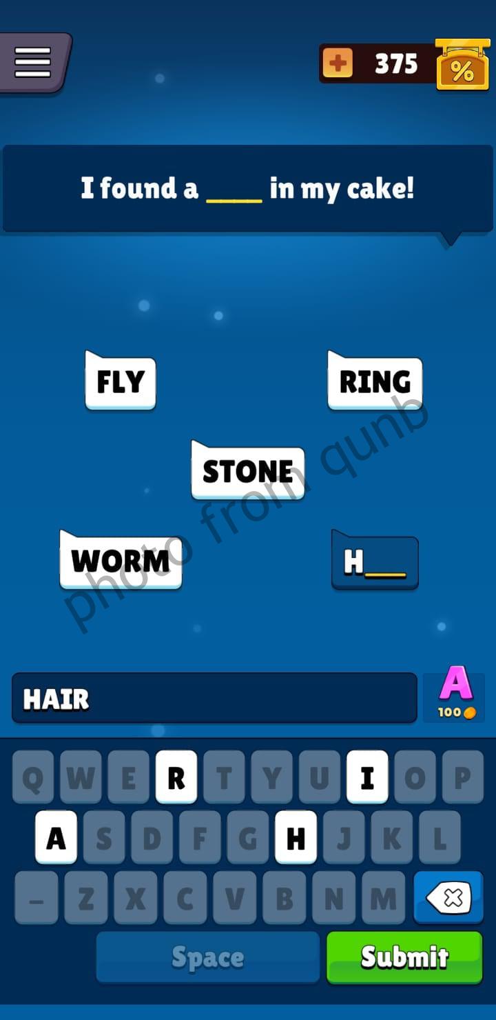 Popular Words Game is created by Unico Studio. Game including hundreds of unique questions, free Daily challenges and bonus rewards. You can play this game offline anytime and anywhere.For pass the level you have to guess 5 words that are missing in the sentence. For this, like hint is provided first letter of the every word. The levels of the game start with the easiest and continue with more difficult puzzles. If you need help for some levels – you can find it in our website. Here you can find photo with all answers for “I found a __ in my cake” which is a question from Level 13 Popular Words Game. Below answers follow link to all answers of the game. Enjoy your game!