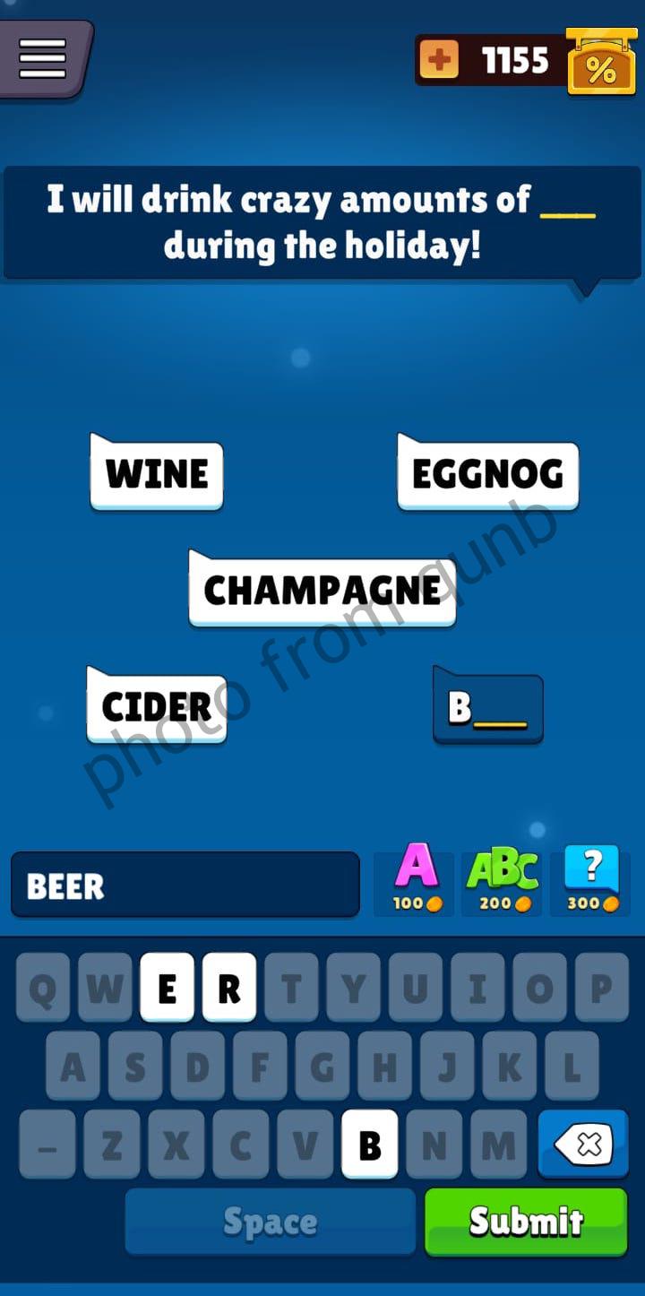 Popular Words Game is created by Unico Studio. Game including hundreds of unique questions, free Daily challenges and bonus rewards. You can play this game offline anytime and anywhere.For pass the level you have to guess 5 words that are missing in the sentence. For this, like hint is provided first letter of the every word. The levels of the game start with the easiest and continue with more difficult puzzles. If you need help for some levels – you can find it in our website. Here you can find photo with all answers for “I will drink crazy amounts of ___ during the holiday” which is a question from Level 256 Popular Words Game. Below answers follow link to all answers of the game. Enjoy your game!