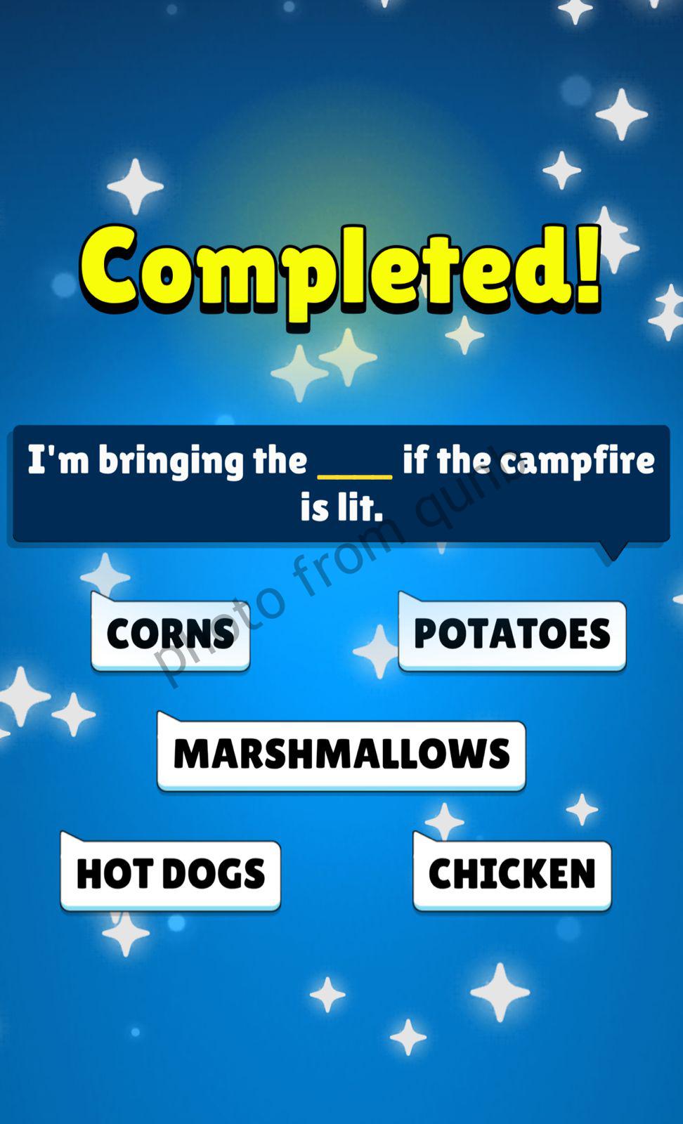 Popular Words Game is created by Unico Studio. Game including hundreds of unique questions, free Daily challenges and bonus rewards. You can play this game offline anytime and anywhere.For pass the level you have to guess 5 words that are missing in the sentence. For this, like hint is provided first letter of the every word. The levels of the game start with the easiest and continue with more difficult puzzles. If you need help for some levels – you can find it in our website. Here you can find photo with all answers for “I’m bringing the __ if the campfire is lit” which is a question from Level 307 Popular Words Game. Below answers follow link to all answers of the game. Enjoy your game!