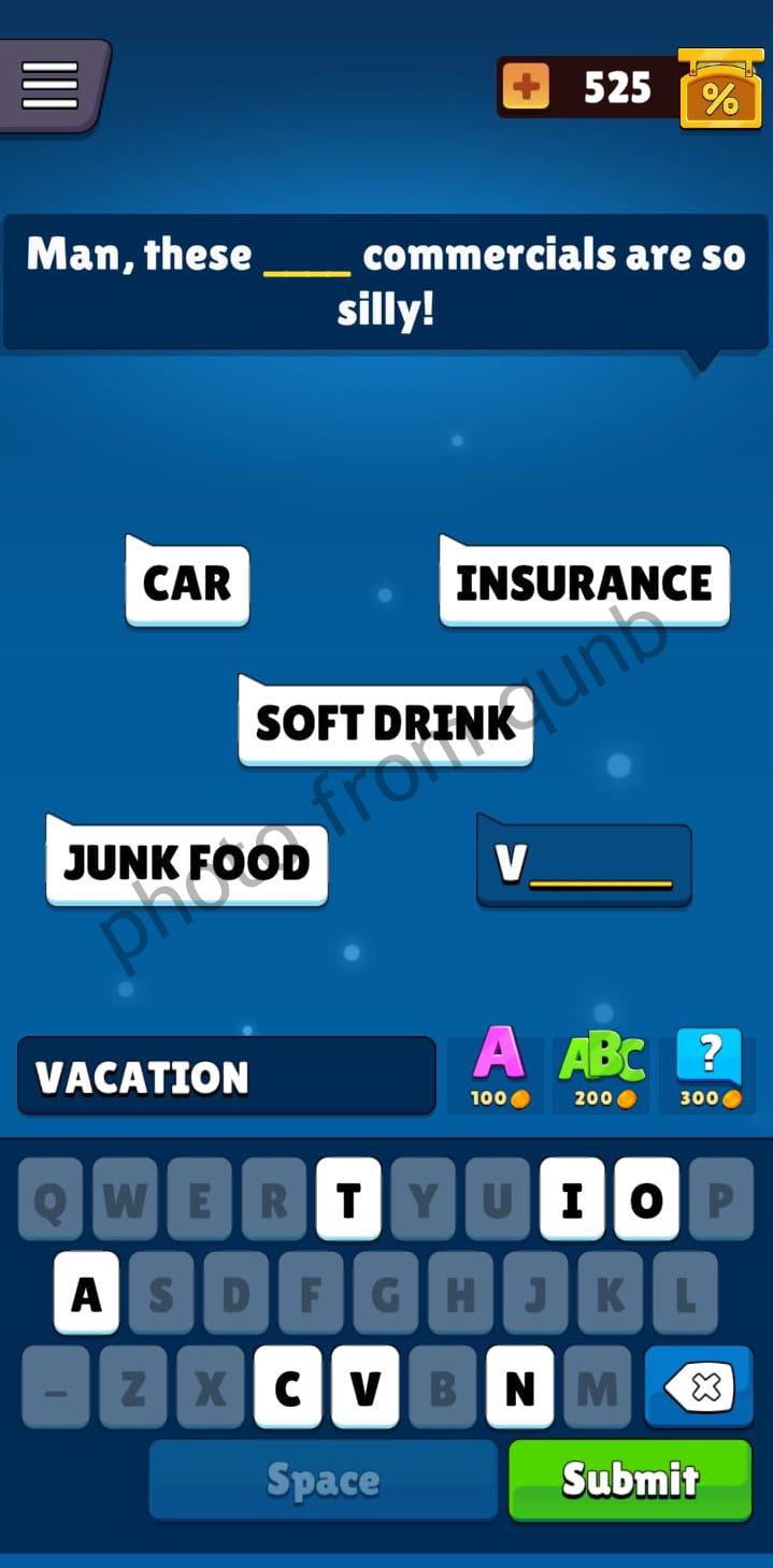 Popular Words Game is created by Unico Studio. Game including hundreds of unique questions, free Daily challenges and bonus rewards. You can play this game offline anytime and anywhere.For pass the level you have to guess 5 words that are missing in the sentence. For this, like hint is provided first letter of the every word. The levels of the game start with the easiest and continue with more difficult puzzles. If you need help for some levels – you can find it in our website. Here you can find photo with all answers for “Man, these ____ commercials are so silly” which is a question from Level 55 Popular Words Game. Below answers follow link to all answers of the game. Enjoy your game!