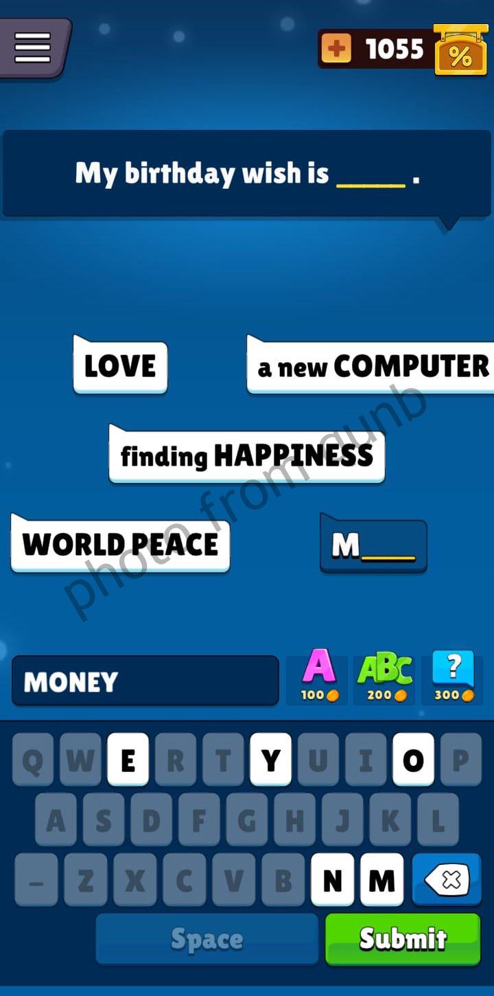 Popular Words Game is created by Unico Studio. Game including hundreds of unique questions, free Daily challenges and bonus rewards. You can play this game offline anytime and anywhere.For pass the level you have to guess 5 words that are missing in the sentence. For this, like hint is provided first letter of the every word. The levels of the game start with the easiest and continue with more difficult puzzles. If you need help for some levels – you can find it in our website. Here you can find photo with all answers for “My birthday wish is _____” which is a question from Level 189 Popular Words Game. Below answers follow link to all answers of the game. Enjoy your game!