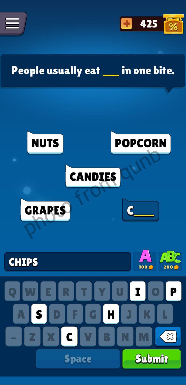 Popular Words Game is created by Unico Studio. Game including hundreds of unique questions, free Daily challenges and bonus rewards. You can play this game offline anytime and anywhere.For pass the level you have to guess 5 words that are missing in the sentence. For this, like hint is provided first letter of the every word. The levels of the game start with the easiest and continue with more difficult puzzles. If you need help for some levels – you can find it in our website. Here you can find photo with all answers for “People usually eat ___ in one bite” which is a question from Level 38 Popular Words Game. Below answers follow link to all answers of the game. Enjoy your game!
