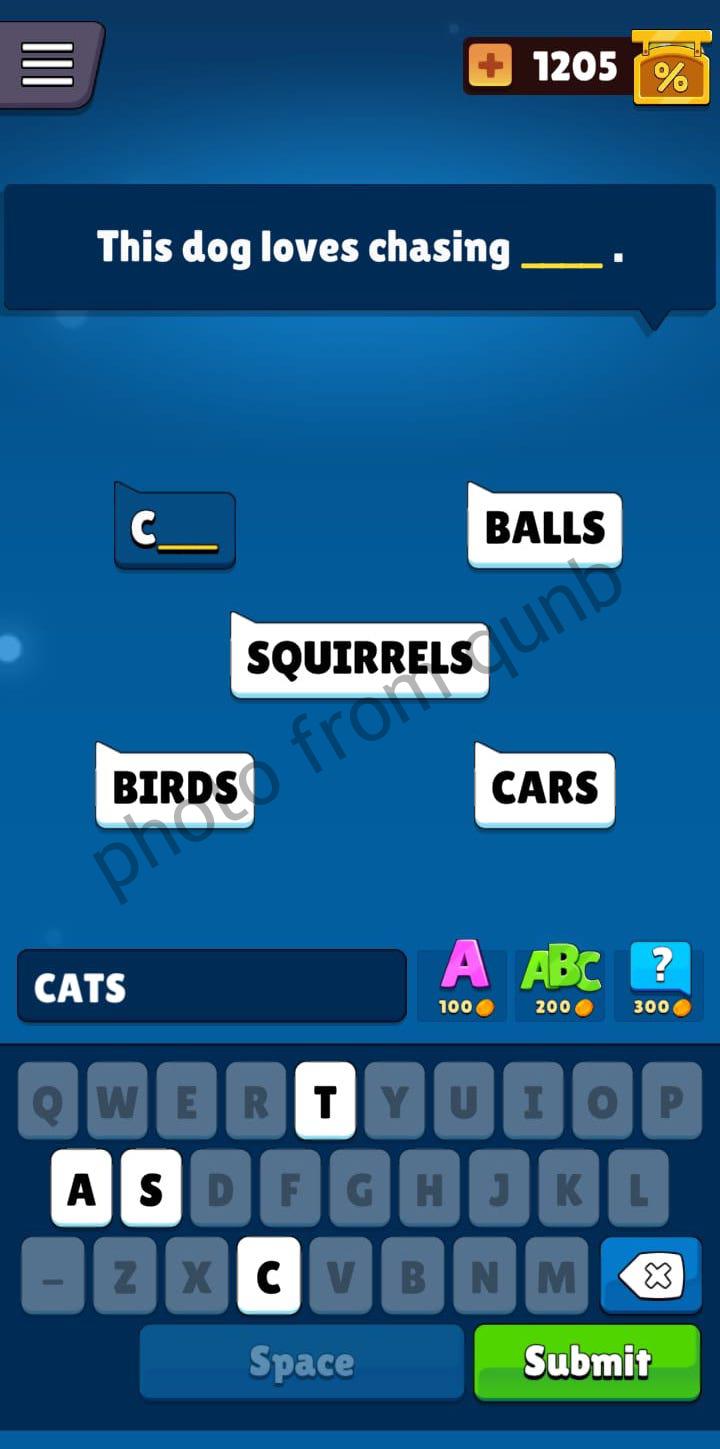 Popular Words Game is created by Unico Studio. Game including hundreds of unique questions, free Daily challenges and bonus rewards. You can play this game offline anytime and anywhere.For pass the level you have to guess 5 words that are missing in the sentence. For this, like hint is provided first letter of the every word. The levels of the game start with the easiest and continue with more difficult puzzles. If you need help for some levels – you can find it in our website. Here you can find photo with all answers for “This dog loves chasing ____” which is a question from Level 287 Popular Words Game. Below answers follow link to all answers of the game. Enjoy your game!