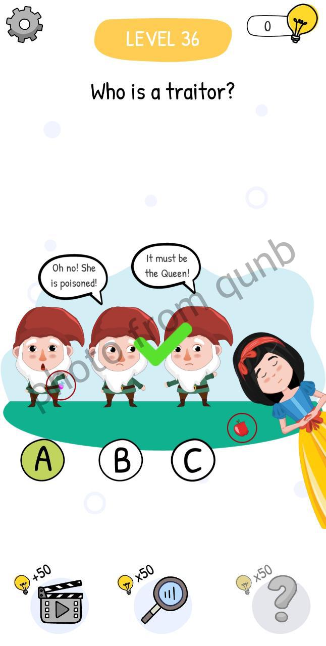 Who is developed by popular brain game producer Unico Studio. This company also developed Brain Test and Brain Test 2 which downloaded more than 50 millions. The game looks similar as Braindom. If you like to play this game then you need help sometimes. When you need help for some levels as Who is Level 36 “Who is a traitor” check this page for help. Answer and solution below.