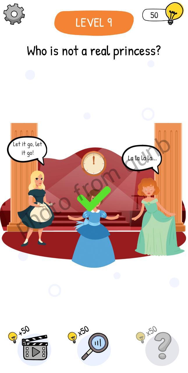 Who is developed by popular brain game producer Unico Studio. This company also developed Brain Test and Brain Test 2 which downloaded more than 50 millions. The game looks similar as Braindom. If you like to play this game then you need help sometimes. When you need help for some levels as Who is Level 9 “Who is not a real princess” check this page for help. Answer and solution below.