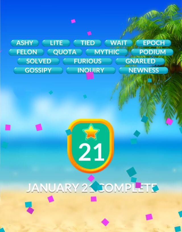 ANSWERS: SOLVED, FELON, LITE, TIED, EPOCH, GNARLED, WAIT, PODIUM, QUOTA, GOSSIPY, MYTHIC, FURIOUS, ASHY, NEWNESS, INQUIRY