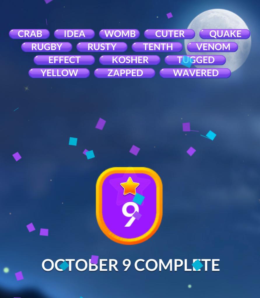WORDS: CRAB, IDEA, WOMB, CUTER, QUAKE, RUGBY, RUSTY, TENTH, VENOM, EFFECT, KOSHER, TUGGED, YELLOW, ZAPPED, WAVERED