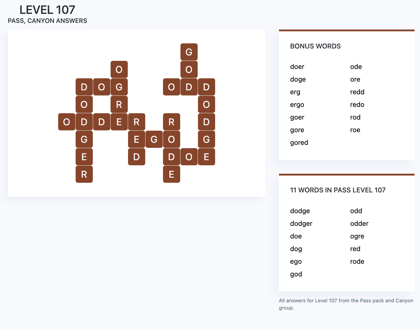 We publish the answers to all levels for Wordscapes, one of the most popular word games. You can find answers and bonus words for Wordscapes level 107 on this page. Please note that there are more than 60 thousand levels in the Wordscapes word game and you can find all the answers on our site.