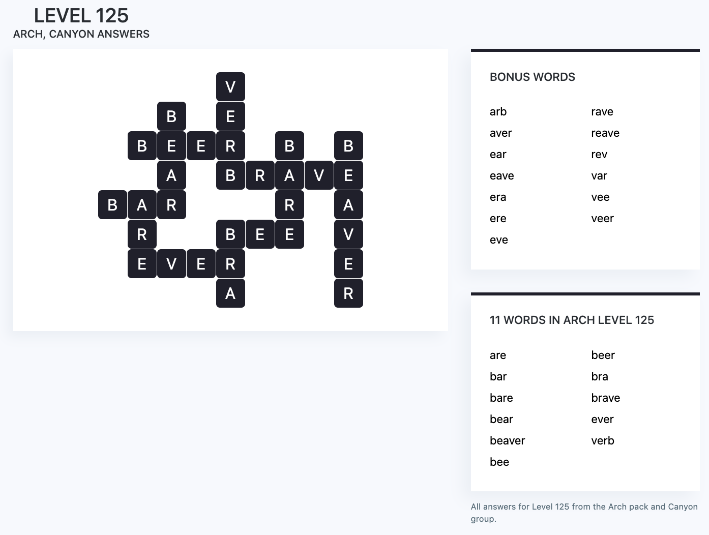 We publish the answers to all levels for Wordscapes, one of the most popular word games. You can find answers and bonus words for Wordscapes level 125 on this page. Please note that there are more than 60 thousand levels in the Wordscapes word game and you can find all the answers on our site.